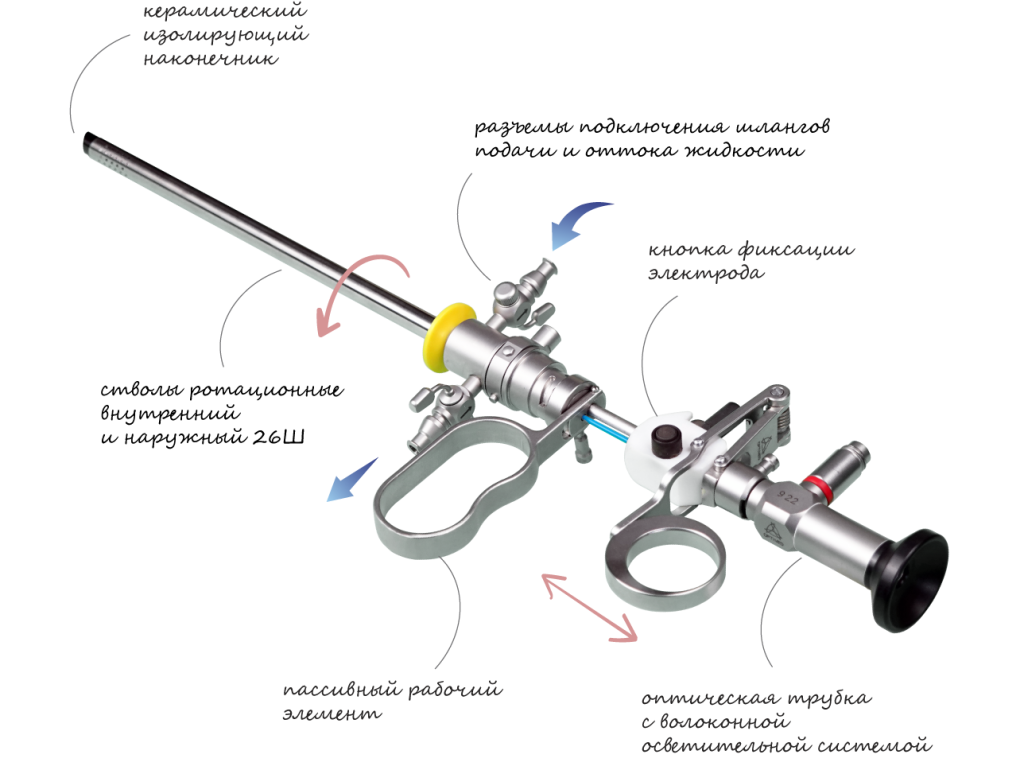 Гистерорезектоскоп ГрО-ВС-01, мод.024, монополярный комплект с пассивным рабочим элементом предназначен для электрорезекции тканей с помощью токов высокой частоты в полости матки при различных внутриматочных патологиях, под визуальным контролем.
