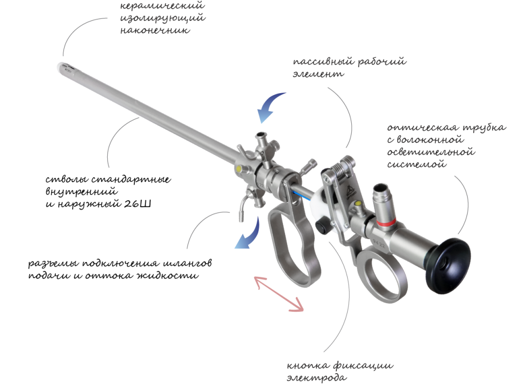 Гистерорезектоскоп ГрО-ВС-01, мод.024, монополярный комплект с пассивным рабочим элементом предназначен для электрорезекции тканей с помощью токов высокой частоты в полости матки при различных внутриматочных патологиях, под визуальным контролем.