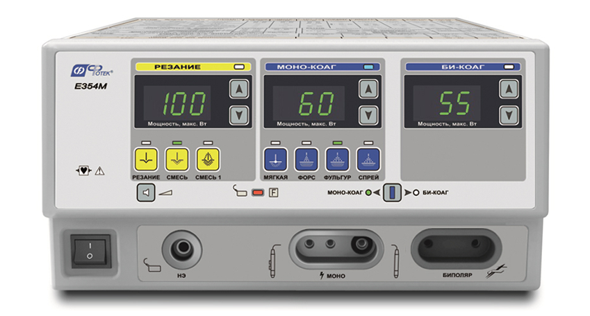 - возможность настройки четырех режимов одновременно: монополярного и биполярного резания, монополярной и биполярной коагуляции